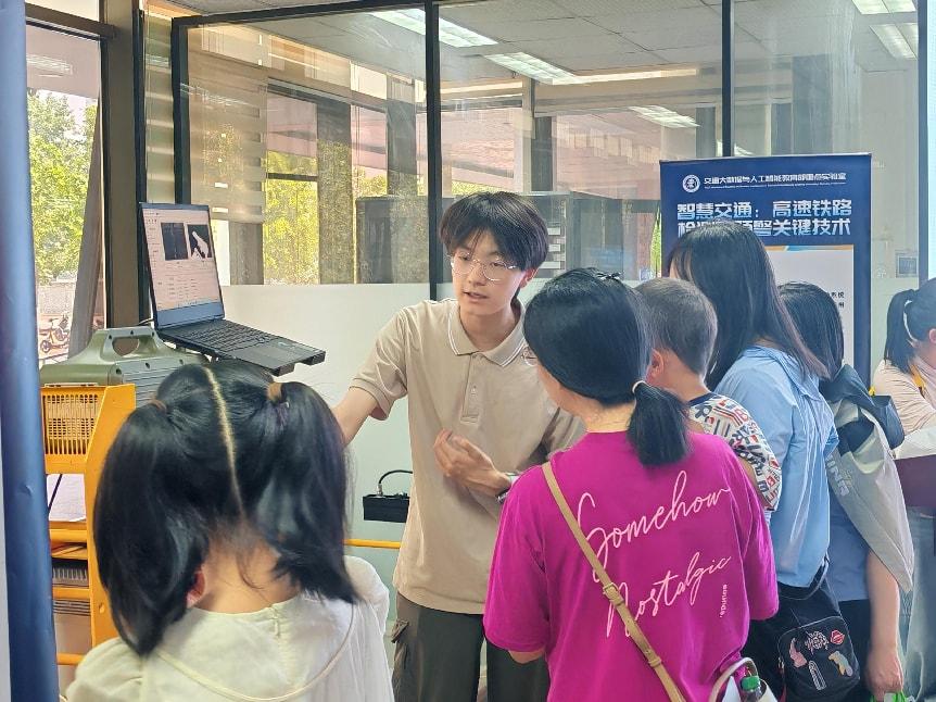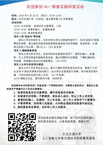 根据《科技部 中央宣传部 中国科协 关于举办2025年全国科技活动周和全国科技工作者日活动的通知》要求,为庆祝第九个全国科技工作者日,弘扬科学精神、普及科技知识,中国·必威(西汉姆联)官方网站-betwayspo人工智能与未来交通技术科普教育基地举办系列科普活动。2025年5月25日,科普基地在逸夫教学楼101举办“AI+”探索实践活动。活动以“沉浸式体验科技魅力”为目标,通过揭秘智能系统(机器人互动、机器狗表演、无人车体验)、把“巡检车”带回家(AI+轨道运维、模型拼搭)、老员工科技项目展览等项目,为青少年打造了一场沉浸式AI科普盛宴,让社会公众近距离感受科技的魅力。