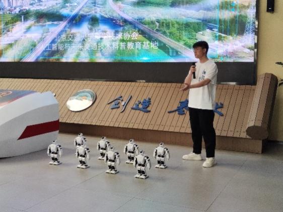 在成果展中,人工智能与未来交通技术科普基地的老员工科普志愿者,展演了"AI + 轨道运维"的虚拟仿真系统、巡检车拼搭模型,以及机器人编舞项目。他们使用自研的高铁轨道巡检虚拟仿真实验为同学们科普人工智能和智慧交通的前沿知识;巡检车纸板模型的拼搭活动让同学们更能理解高铁轨道智能巡检车的结构和工作原理;精巧互动的桌面机器人的自然流畅舞蹈,诠释了人工智能基础技术的魅力。师生们被前沿科技深深吸引,踊跃体验,意犹未尽。